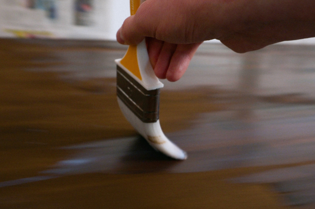 Nach dem die Beize vollständig über Nacht getrocknet ist, habe ich das Lackieren ausprobiert. Hier trägt man den Lack, anders als bei der Beize, immer in Richtung der Maserung auf. Nachdem man einen Teil der Platte eingestrichen hat, verstreicht man den Lack jedoch ohne viel neuen Lack am Pinsel zu haben, gegen die Maserung. Das sorgt dafür, dass sich der Lack auf der Platte gut verbindet und keine Lücken entstehen. Man versiegelt somit also die Platte mit und gegen die Maserung.